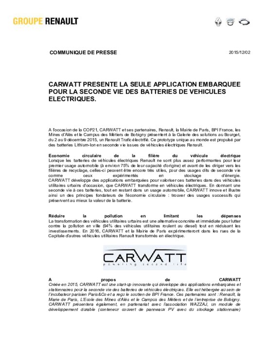 A l’occasion de la COP21, CARWATT et ses partenaires, Renault, la Mairie de Paris, BPI France, les Mines d’Alès et le Campus des Métiers de Bobigny présentent à la Galerie des solutions au Bourget, du 2 au 9 décembre 2015, un Renault Trafic électrifié. Ce prototype unique au monde est propulsé par des batteries Lithium-Ion en seconde vie issues de véhicules électriques Renault.