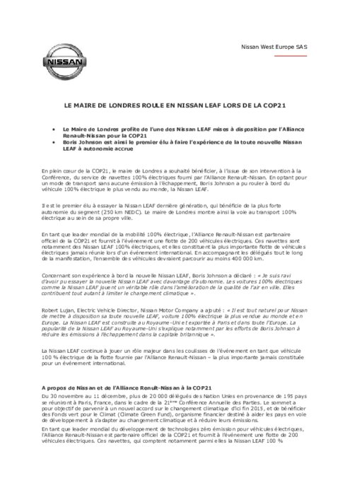 Constructeurs 10 décembre 2015 - 14:26 Le Maire de Londres profite de l’une des Nissan LEAF mises à disposition par l’Alliance Renault-Nissan pour la COP21. Boris Johnson est ainsi le premier élu à faire l’expérience de la toute nouvelle Nissan LEAF à autonomie accrue. PDF (58 Ko) Télécharger