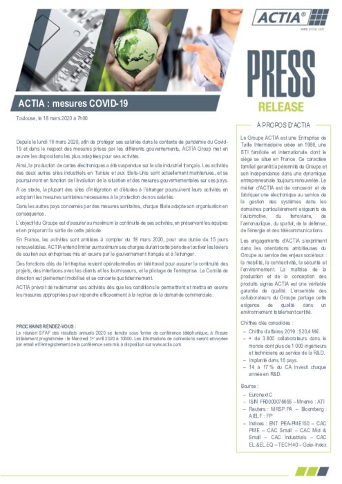 Depuis le lundi 16 mars 2020, afin de protéger ses salariés dans le contexte de pandémie du Covid-19 et dans le respect des mesures prises par les différents gouvernements, ACTIA Group met en œuvre les dispositions les plus adaptées pour ses activités. Ainsi, la production de cartes électroniques a été suspendue sur le site industriel français. Les activités des deux autres sites industriels en Tunisie et aux Etats-Unis sont actuellement maintenues...