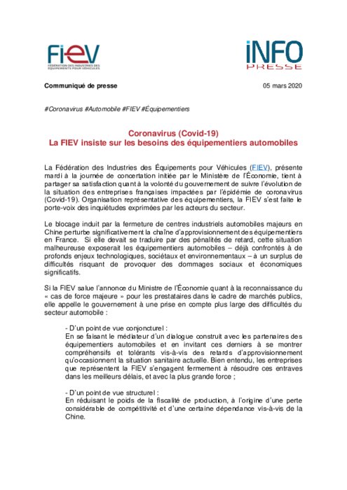 La Fédération des Industries des Équipements pour Véhicules (FIEV), présente mardi à la journée de concertation initiée par le Ministère de l’Économie, tient à partager sa satisfaction quant à la volonté du gouvernement de suivre l’évolution de la situation des entreprises françaises impactées par l’épidémie de coronavirus (Covid-19). Organisation représentative des équipementiers, la FIEV s’est faite le porte-voix des inquiétudes exprimées par les acteurs du secteur.