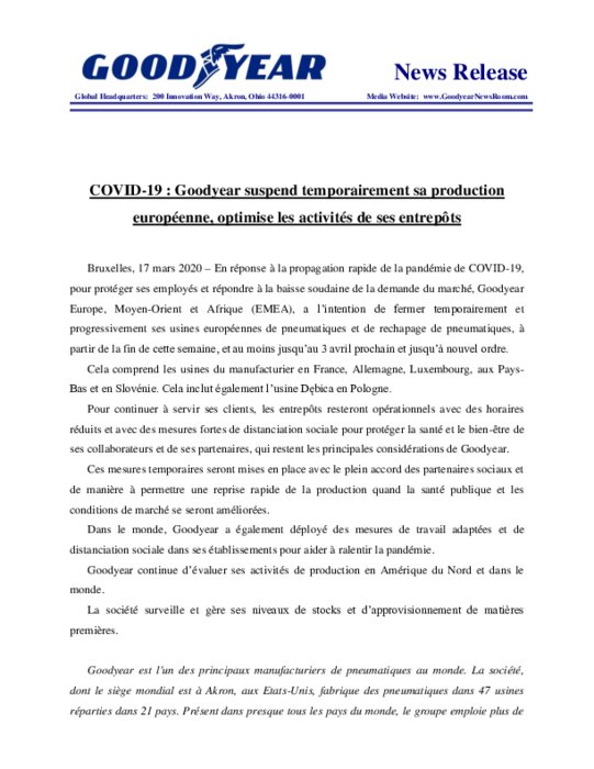 En réponse à la propagation rapide de la pandémie de COVID-19, pour protéger ses employés et répondre à la baisse soudaine de la demande du marché, Goodyear Europe, Moyen-Orient et Afrique (EMEA), a l’intention de fermer temporairement et progressivement ses usines européennes de pneumatiques et de rechapage de pneumatiques, à partir de la fin de cette semaine, et au moins jusqu’au 3 avril prochain et jusqu’à nouvel ordre...