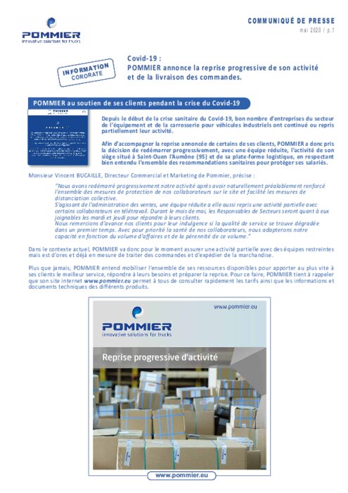 Depuis le début de la crise sanitaire du Covid-19, les entreprises du secteur de l'équipement et de la carrosserie pour véhicules industriels ont continué ou repris partiellement leur activité. Afin d'accompagner la reprise annoncée de certains de ses clients, Pommier a donc pris la décision de redémarrer progressivement, avec une équipe réduite, l'activité de son siège situé à Saint-Ouen l'Aumône (95) et de sa plate-forme logistique, en respectant l'ensemble des recommandations sanitaires...
