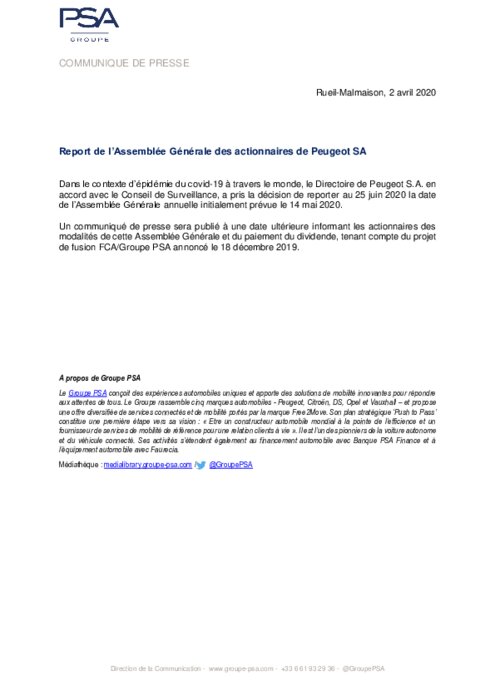 Constructeurs 02 avril 2020 - 11:05 Tout en assurant la protection de ses salariés par un dispositif de mesures renforcées et de télétravail, le Groupe PSA choisit de soutenir ceux et celles qui œuvrent au quotidien en " première ligne ". PDF (295 Ko) Télécharger