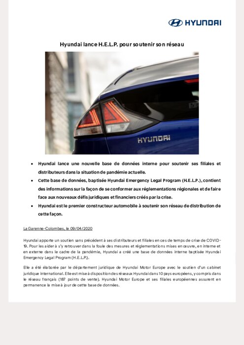 Hyundai apporte un soutien sans précédent à ses distributeurs et filiales en ces de temps de crise de COVID-19. Pour les aider à s’y retrouver dans la foule des mesures et réglementations mises en œuvre, en interne et en externe dans le cadre de la pandémie, Hyundai a créé une base de données interne baptisée Hyundai Emergency Legal Program (H.E.L.P.).
