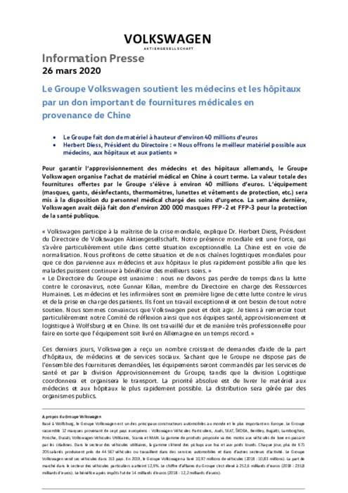 Coronavirus: le Groupe VW fait don de fournitures médicales en provenance de Chine