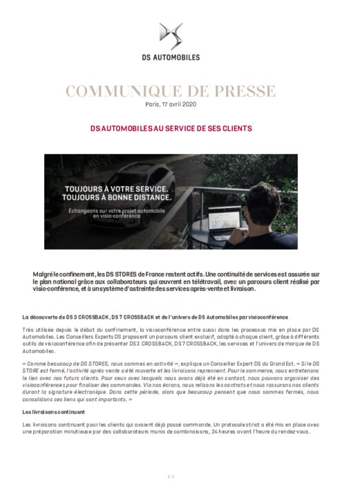 Malgré le confinement, les DS STORES de France restent actifs. Une continuité de services est assurée sur le plan national grâce aux collaborateurs qui œuvrent en télétravail, avec un parcours client réalisé par visio-conférence, et à un système d'astreinte des services après-vente et livraison.