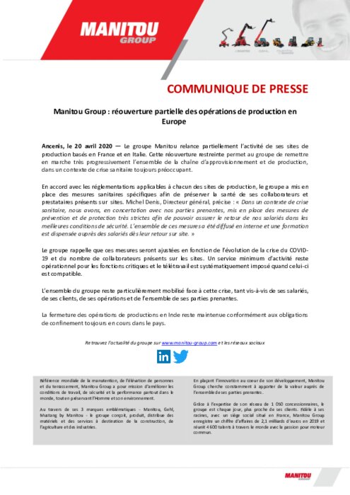 Le groupe Manitou relance partiellement l'activité de ses sites de production basés en France et en Italie. Cette réouverture restreinte permet au groupe de remettre en marche très progressivement l'ensemble de la chaîne d'approvisionnement et de production, dans un contexte de crise sanitaire toujours préoccupant.