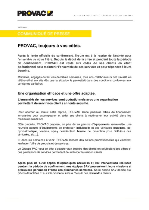 Après la levée officielle du confinement, l’heure est à la reprise de l’activité pour l’ensemble de notre filière. Depuis le début de la crise et pendant toute la période de confinement, PROVAC est resté aux côtés de ses clients en étant opérationnel pour maintenir l’ensemble de ses services et pour répondre à leurs besoins.