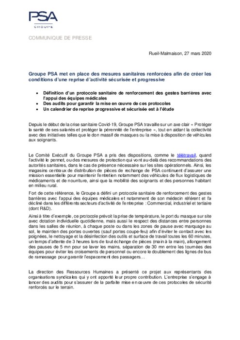 "Nous ne ferons aucun compromis sur la santé de nos salariés, afin que le redémarrage industriel nécessaire à la pérennité de l'entreprise puisse se faire dans des conditions optimales", promet Carlos Tavares, président du directoire de PSA, cité dans le communiqué.