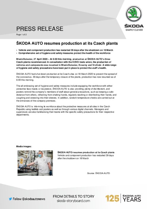 Constructeurs 27 avril 2020 - 09:35 A 6h00 lundi matin, la production des trois usines tchèques de SKODA AUTO a repris. En consultation avec le syndicat KOVO, la production de véhicules et de composants a été reprise à Mlad Boleslav, Kvasiny et Vrchlabk. PDF (253 Ko) Télécharger