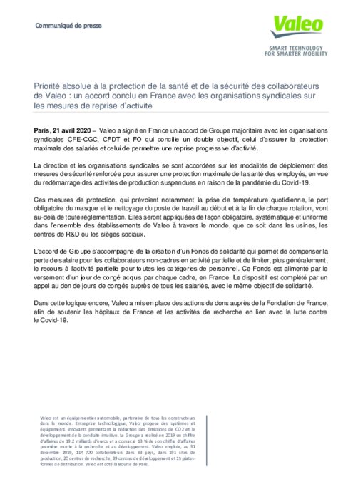 L'accord, signé en France avec la CFE-CGC, la CFDT et FO, "concilie un double objectif, celui d'assurer la protection maximale des salariés et celui de permettre une reprise progressive d'activité", a déclaré l'équipementier français dans un communiqué.