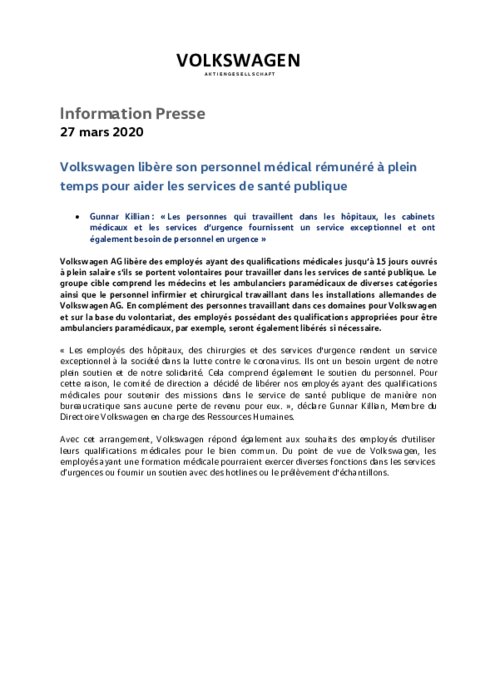Volkswagen libère des employés ayant des qualifications médicales jusqu’à 15 jours ouvrés à plein salaire s'ils se portent volontaires pour travailler dans les services de santé publique. Le groupe cible comprend les médecins et les ambulanciers paramédicaux de diverses catégories ainsi que le personnel infirmier et chirurgical travaillant dans les installations allemandes de Volkswagen. En complément des personnes travaillant dans ces domaines pour Volkswagen et sur la base du volontariat...