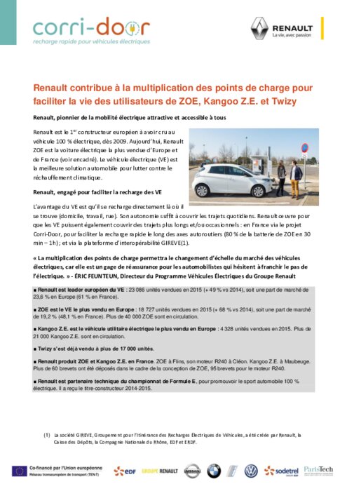 Avec 200 bornes installées sur tout le territoire français, Corri-Door, réseau pilote en Europe, favorise l’essor de la mobilité électrique. Renault est le 1er constructeur européen à avoir cru au véhicule 100 % électrique, dès 2009. Aujourd’hui, Renault ZOE est la voiture électrique la plus vendue d’Europe et de France. Le véhicule électrique (VE) est la meilleure solution automobile pour lutter contre le réchauffement climatique.