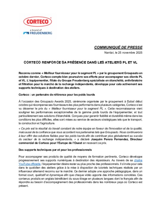 Reconnu comme « Meilleur fournisseur pour le segment PL »par le groupement Groupauto en octobre dernier, Corteco compte bien poursuivre ses efforts pour accompagner ses clients PL et VL. L’équipementier, filiale du Groupe Freudenberg spécialisée en étanchéité, antivibratoire et filtration pour le marché de la rechange indépendante, développe pour cela activement ses supports techniques à destination des ateliers.