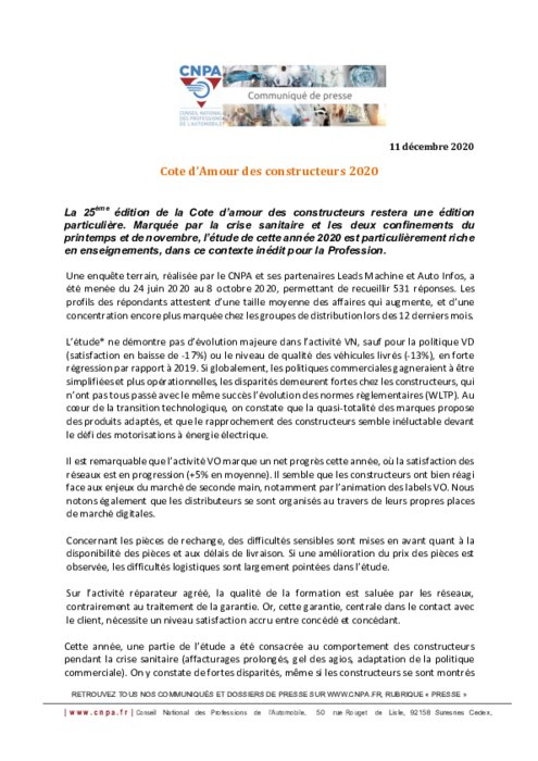 La 25ème édition de la Cote d’amour des constructeurs restera une édition particulière. Marquée par la crise sanitaire et les deux confinements du printemps et de novembre, l’étude de cette année 2020 est particulièrement riche en enseignements, dans ce contexte inédit pour la Profession. Une enquête terrain, réalisée par le CNPA et ses partenaires Leads Machine et Auto Infos, a été menée du 24 juin 2020 au 8 octobre 2020, permettant de recueillir 531 réponses...