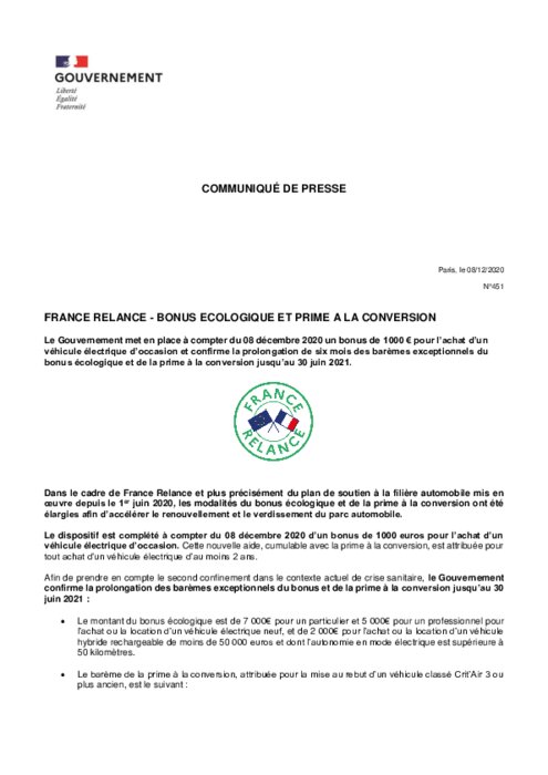 De plus, pour "prendre en compte le second confinement dans le contexte actuel de crise sanitaire", les barèmes "exceptionnels" des bonus écologiques et de la prime à la conversion, qui devaient s'achever à la fin de l'année, sont prolongés jusqu'au 30 juin 2021.