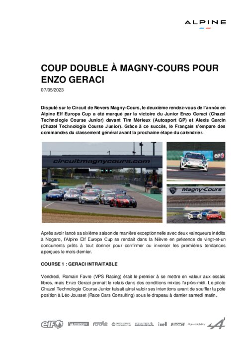 Disputé sur le Circuit de Nevers Magny-Cours, le deuxième rendez-vous de l’année en Alpine Elf Europa Cup a été marqué par la victoire du Junior Enzo Geraci (Chazel Technologie Course Junior) devant Tim Mérieux (Autosport GP) et Alexis Garcin (Chazel Technologie Course Junior). Grâce à ce succès, le Français s’empare des commandes du classement général avant la prochaine étape du calendrier.