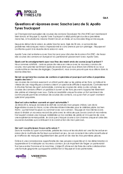 Le Championnat européen de courses de camions Goodyear FIA (FIA ETRC) est maintenant bien lancé, et l'équipe SL Apollo Tyres Trucksport a déjà participé aux deux premières manches, à l'Autodromo Misano World Circuit, en Italie, et au Slovakia Ring en Slovaquie. Depuis le début de la saison, le pilote Sascha Lenz, âgé de 35 ans, a surmonté des problèmes mécaniques mais a impressionné la concurrence par son pilotage ; l'équipe est confiante quant à la réussite de la saison à venir.