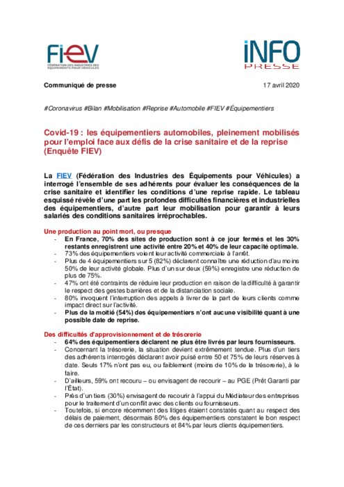 La FIEV (Fédération des Industries des Équipements pour Véhicules) a interrogé l'ensemble de ses adhérents pour évaluer les conséquences de la crise sanitaire et identifier les conditions d'une reprise rapide. Le tableau esquissé révèle d'une part les profondes difficultés financières et industrielles des équipementiers, d'autre part leur mobilisation pour garantir à leurs salariés des conditions sanitaires irréprochables.