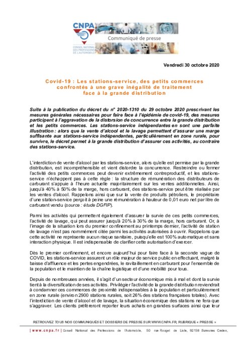 Suite à la publication du décret du n° 2020-1310 du 29/10/2020 prescrivant les mesures générales nécessaires pour faire face à l'épidémie de covid-19, des mesures participent à l’aggravation de la distorsion de concurrence entre la grande distribution et les petits commerces. Les stations-service indépendantes en sont une parfaite illustration : le décret permet à la grande distribution d’assurer ces activités, au contraire des stations-service...