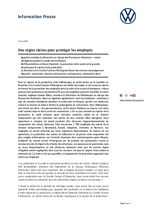 Pour la reprise de la production chez Volkswagen, la santé prime sur la rapidité. La Direction et le Comité Central d’Entreprise ont défini des règles et des mesures claires en faveur de la protection des employés dans le cadre d’un accord d’entreprise. " Nous prenons des précautions maximales afin que nos employés puissent travailler en toute sécurité, explique Gunnar Kilian, membre du Directoire de Volkswagen en charge des Ressources Humaines..."