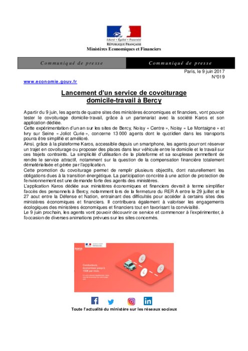 A partir du 9 juin, les agents de quatre sites des ministères économiques et financiers, vont pouvoir tester le covoiturage domicile-travail, grâce à un partenariat avec la société Karos et son application dédiée. Cette expérimentation d’un an sur les sites de Bercy, Noisy " Centre ", Noisy " Le Montaigne " et Ivry sur Seine " Joliot Curie ", concerne 13 000 agents dont le quotidien dans les transports pourra être simplifié et amélioré.