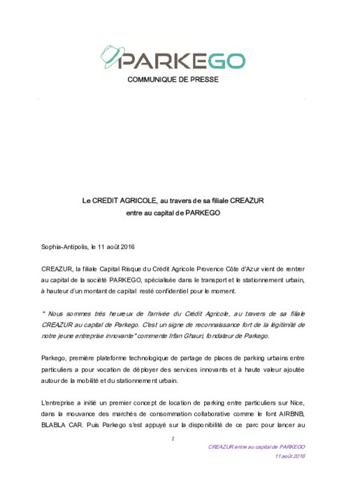 CREAZUR, la filiale Capital Risque du Crédit Agricole Provence Côte d'Azur vient de rentrer au capital de la société PARKEGO, spécialisée dans le transport et le stationnement urbain, à hauteur d’un montant de capital resté confidentiel pour le moment.