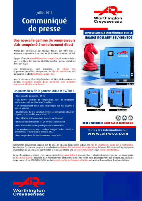 Worthington Creyssensac est heureux d’élargir son offre avec 3 nouveaux compresseurs à vis : ROLLAIR 35, ROLLAIR 40E et ROLLAIR 50E. Équipés d’un tout nouvel élément de compression, ils sont destinés à tous les métiers de l’industrie et de l’automobile, avec des débits de 209 à 374 m3/h.