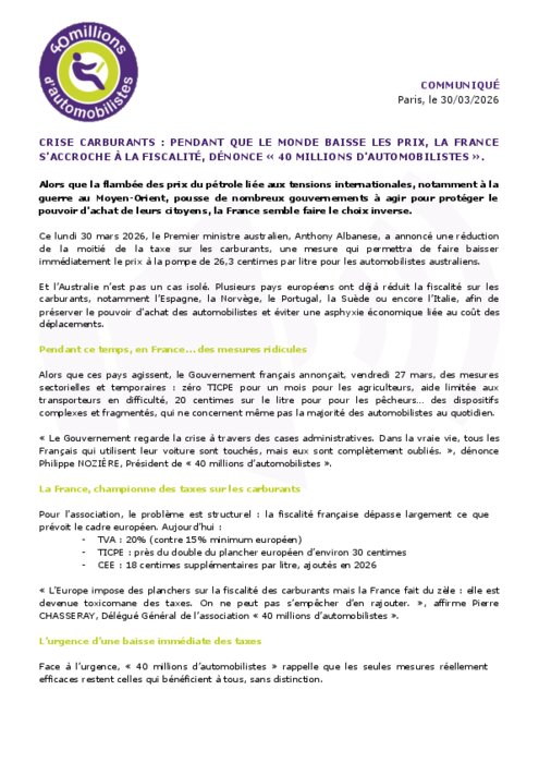 Services 30 mars 2026 - 16:49 Alors que la flambée des prix du pétrole liée aux tensions internationales, notamment à la guerre au Moyen-Orient, pousse de nombreux gouvernements à agir pour protéger le pouvoir d’achat de leurs citoyens, la France semble faire le choix inverse. PDF (179 Ko) Télécharger