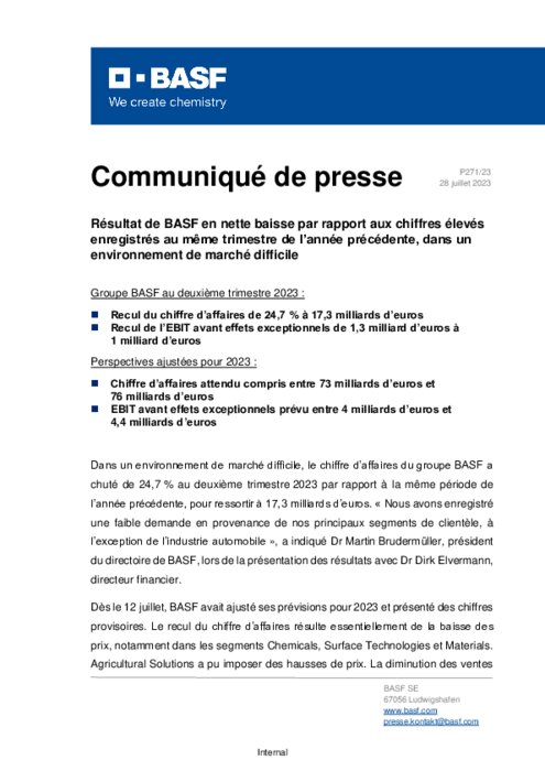"Nous ne prévoyons pas de nouvel affaiblissement de la demande au niveau mondial au second semestre 2023. En effet, les stocks de matières premières chimiques dans la plupart des industries clientes ont déjà été considérablement réduits", a explique M. Brudermüller.