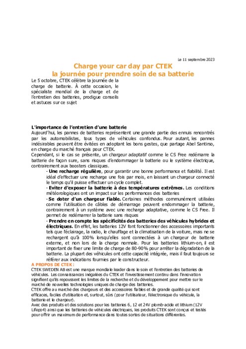 Equipementiers 11 septembre 2023 - 15:46 Le 5 octobre, CTEK célèbre la journée de la charge de batterie. À cette occasion, le spécialiste mondial de la charge et de l’entretien des batteries, prodigue conseils et astuces sur ce sujet. PDF (80 Ko) Télécharger