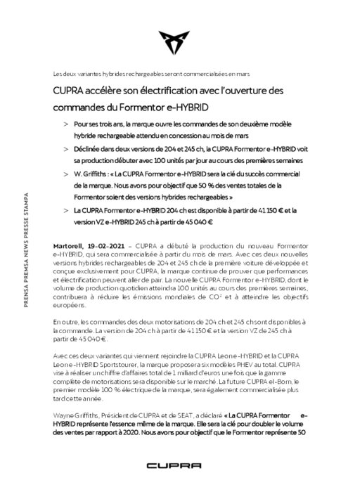 CUPRA a débuté la production du nouveau Formentor e-HYBRID, qui sera commercialisée à partir du mois de mars. Avec ces deux nouvelles versions hybrides rechargeables de 204 et 245 ch de la première voiture développée et conçue exclusivement pour CUPRA, la marque continue de prouver que performances et électrification peuvent aller de pair. La nouvelle CUPRA Formentor e-HYBRID, dont le volume de production quotidien atteindra 100 unités au cours des premières semaines...