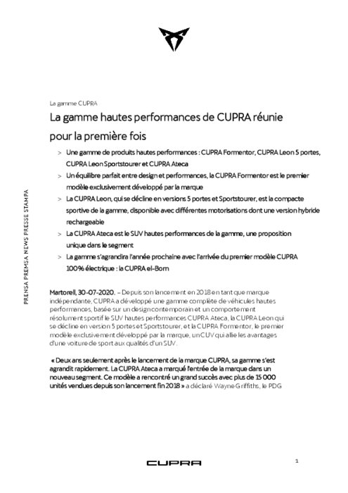 Depuis son lancement en 2018 en tant que marque indépendante, CUPRA a développé une gamme complète de véhicules hautes performances, basée sur un design contemporain et un comportement résolument sportif le SUV hautes performances CUPRA Ateca, la CUPRA Leon qui se décline en version 5 portes et Sportstourer, et la CUPRA Formentor, le premier modèle exclusivement développé par la marque, un CUV qui allie les avantages d'une voiture de sport aux qualités d'un SUV.