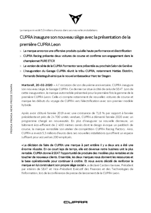 A l’occasion de son deuxième anniversaire, CUPRA inaugure son nouveau siège, le Garage CUPRA. Ce dernier se situe à côté de celui de SEAT. Lors de cette inauguration, la marque automobile a présenté pour la première fois la gamme de la première CUPRA Leon. Celle-ci compte notamment de nouvelles voitures de course et marque les débuts du voyage de CUPRA vers l'électrification avec son premier modèle hybride.
