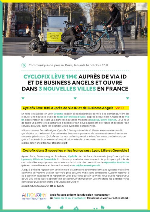 En forte croissance en 2017, Cyclofx, leader de la réparation de vélo à la demande, vient de clôturer une nouvelle levée de fonds de 1 million d’euros auprès de Business Angels et de via iD, accélérateur de start-ups dans les nouvelles mobilités (smoove, Drivy, Heetch, ...) Ce tour de table va permettre à la start-up d’accélérer son développement en France et de lancer son service, dès 2018, dans les grandes villes cyclables européennes.