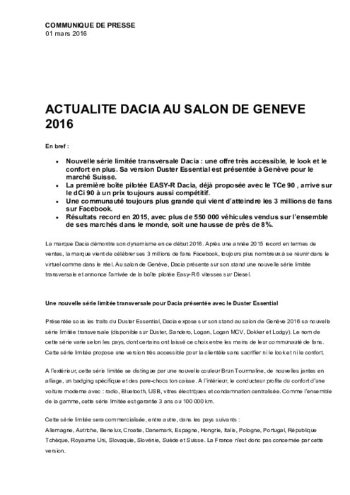 La marque Dacia démontre son dynamisme en ce début 2016. Après une année 2015 record en termes de ventes, la marque vient de célébrer ses 3 millions de fans Facebook, toujours plus nombreux à se réunir dans le virtuel comme dans le réel. Au salon de Genève, Dacia présente sur son stand une nouvelle série limitée transversale et annonce l’arrivée de la boîte pilotée Easy-R 6 vitesses sur Diesel.