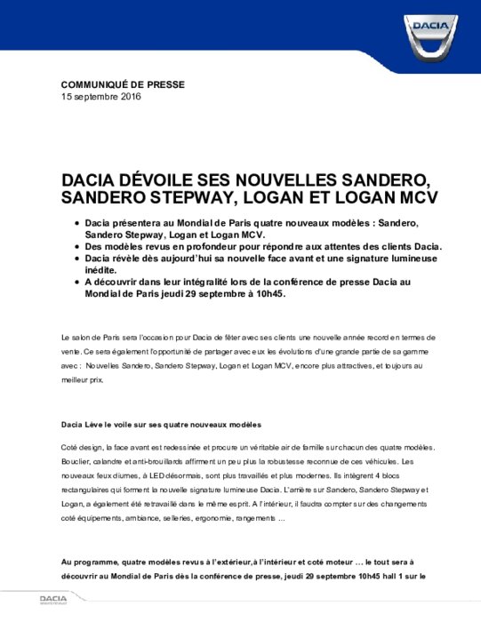 Le salon de Paris sera l’occasion pour Dacia de fêter avec ses clients une nouvelle année record en termes de vente. Ce sera également l’opportunité de partager avec eux les évolutions d’une grande partie de sa gamme avec : Nouvelles Sandero, Sandero Stepway, Logan et Logan MCV, encore plus attractives, et toujours au meilleur prix.