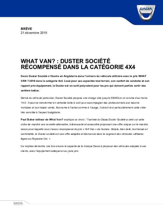 Dacia Duster Société s’illustre en Angleterre dans l’univers du véhicule utilitaire avec le prix WHAT VAN ? 2016 dans la catégorie 4x4. Loué pour ses capacités tout terrain, son confort de conduite et son rapport prix-équipement, le Duster est un outil polyvalent pour les pro qui doivent parfois sortir des sentiers battus.