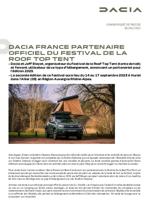 Dacia et Jeff Bloyet, organisateur du Festival de la Roof Top Tent (tente de toit) et fervent utilisateur de ce type d’hébergement, annoncent un partenariat pour l’édition 2023. La seconde édition de ce festival aura lieu du 14 au 17 septembre 2023 à Huriel dans l’Allier (03) en Région Auvergne Rhône-Alpes.