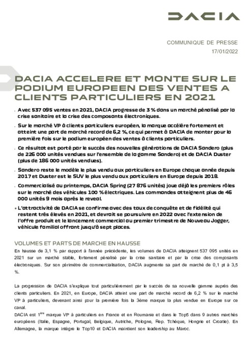 Avec 537 095 ventes en 2021, DACIA progresse de 3 % dans un marché pénalisé par la crise sanitaire et la crise des composants électroniques. Sur le marché VP à clients particuliers européen, la marque accélère fortement et atteint une part de marché record de 6,2 %, ce qui permet à DACIA de monter pour la première fois sur le podium européen des ventes à clients particuliers. Ce résultat est porté par le succès des nouvelles générations de DACIA Sandero...