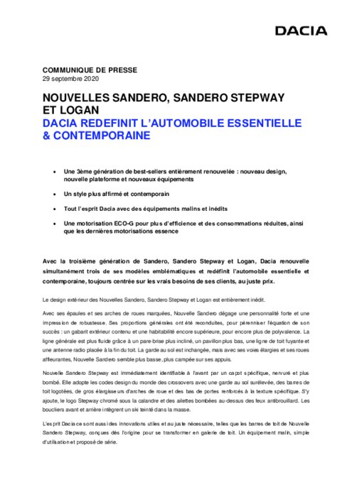 Avec la troisième génération de Sandero, Sandero Stepway et Logan, Dacia renouvelle simultanément trois de ses modèles emblématiques et redéfinit l’automobile essentielle et contemporaine, toujours centrée sur les vrais besoins de ses clients, au juste prix.