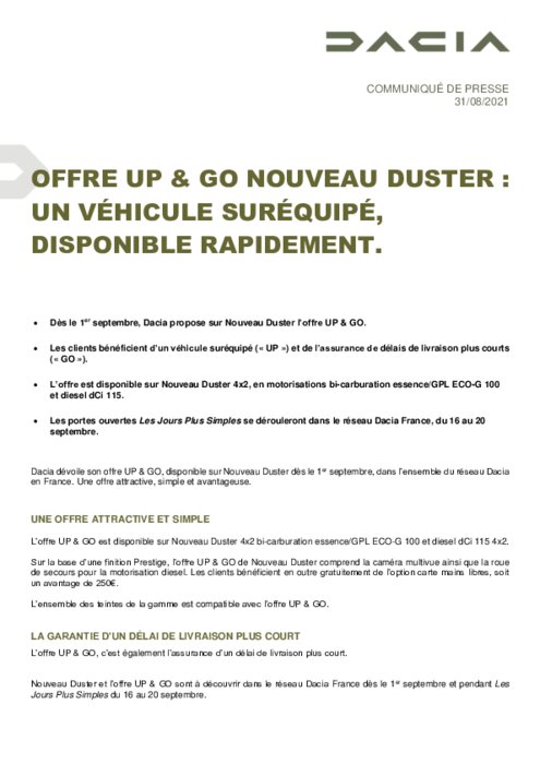 Dacia dévoile son offre UP & GO, disponible sur Nouveau Duster dès le 1er septembre, dans l’ensemble du réseau Dacia en France. Une offre attractive, simple et avantageuse.