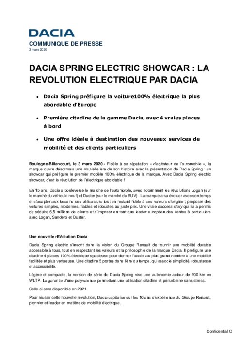 Fidèle à sa réputation " d’agitateur de l’automobile ", la marque ouvre désormais une nouvelle ère de son histoire avec la présentation de Dacia Spring : un showcar qui préfigure le premier modèle 100% électrique de la marque. Avec Dacia Spring electric showcar, c’est la révolution de l’électrique abordable !