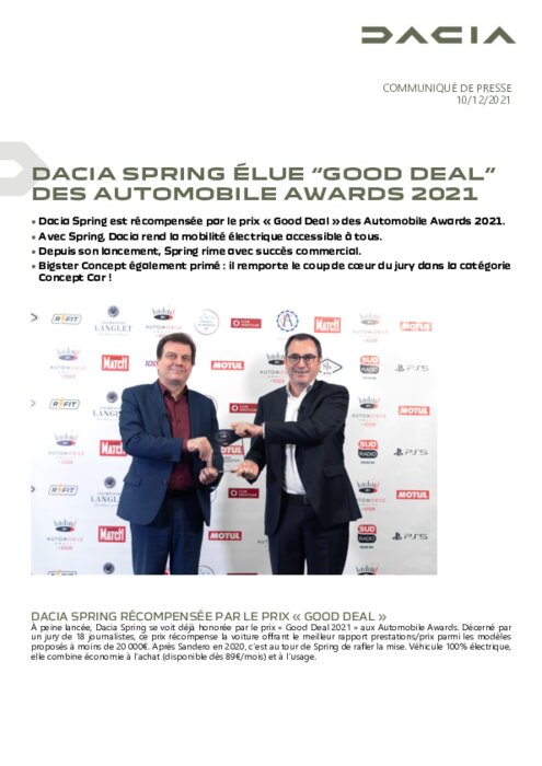 À peine lancée, Dacia Spring se voit déjà honorée par le prix « Good Deal 2021 » aux Automobile Awards. Décerné par un jury de 18 journalistes, ce prix récompense la voiture offrant le meilleur rapport prestations/prix parmi les modèles proposés à moins de 20 000€. Après Sandero en 2020, c’est au tour de Spring de rafler la mise. Véhicule 100% électrique, elle combine économie à l’achat (disponible dès 89€/mois) et à l’usage...