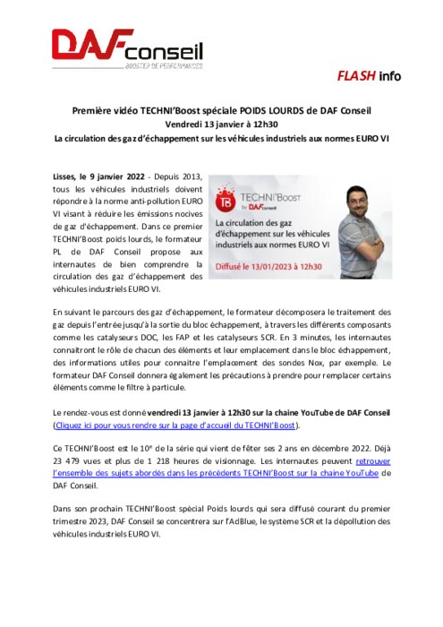 Services 09 janvier 2023 - 10:37 La première vidéo TECHNI’Boost spéciale POIDS LOURDS de DAF Conseil sera disponible vendredi 13 janvier à 12h30 sur le thème : la circulation des gaz d’échappement sur les véhicules industriels aux normes EURO VI. PDF (302 Ko) Télécharger