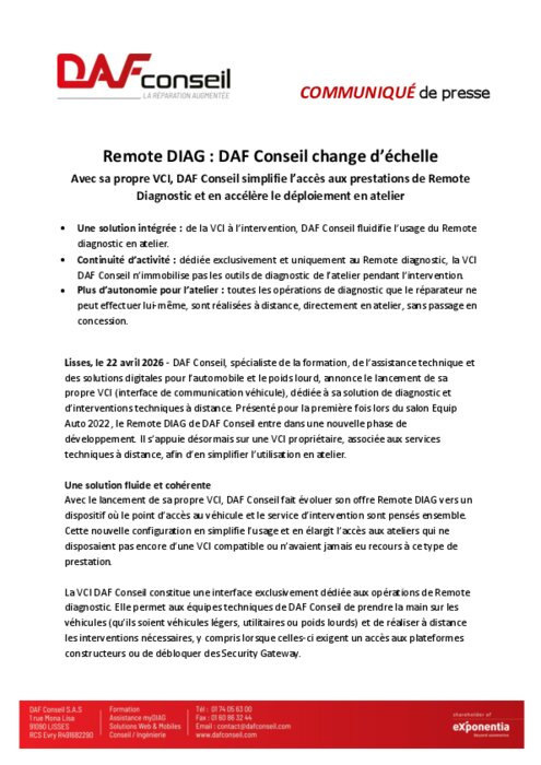 DAF Conseil, spécialiste de la formation, de l’assistance technique et des solutions digitales pour l’automobile et le poids lourd, annonce le lancement de sa propre VCI (interface de communication véhicule), dédiée à sa solution de diagnostic et d’interventions techniques à distance. Présenté pour la première fois lors du salon Equip Auto 2022, le Remote DIAG de DAF Conseil entre dans une nouvelle phase de développement. Il s’appuie désormais sur une VCI propriétaire, associée aux services techniques à distance, afin d’en simplifier l’utilisation en atelier.