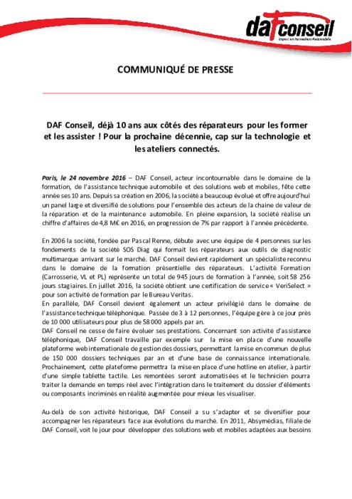 DAF Conseil, acteur incontournable dans le domaine de la formation, de l'assistance technique automobile et des solutions web et mobiles, fête cette année ses 10 ans. Depuis sa création en 2006, la société a beaucoup évolué et offre aujourd'hui un panel large et diversifié de solutions pour l'ensemble des acteurs de la chaine de valeur de la réparation et de la maintenance automobile. En pleine expansion, la société réalise un chiffre d'affaires de 4,8 M€ en 2016.