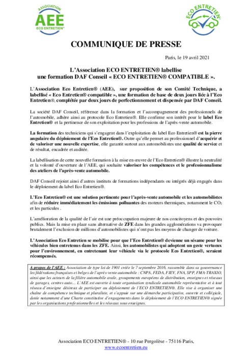 L’Association Eco Entretien® (AEE), sur proposition de son Comité Technique, a labellisé « Eco Entretien® compatible », une formation de base de deux jours liée à l’Eco Entretien®, complétée par deux jours de perfectionnement et dispensée par DAF Conseil.