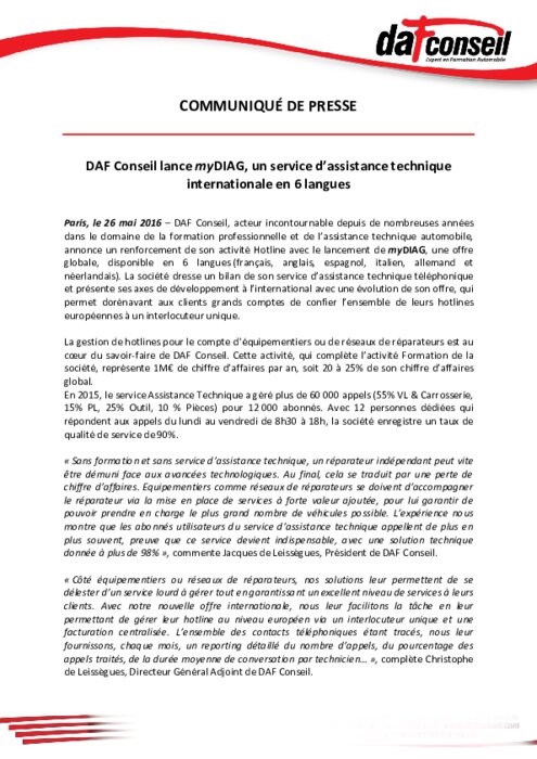 DAF Conseil, acteur incontournable depuis de nombreuses années dans le domaine de la formation professionnelle et de l’assistance technique automobile, annonce un renforcement de son activité Hotline avec le lancement de myDIAG, une offre globale, disponible en 6 langues (français, anglais, espagnol, italien, allemand et néerlandais). La société dresse un bilan de son service d’assistance technique téléphonique et présente ses axes de développement à l’international.