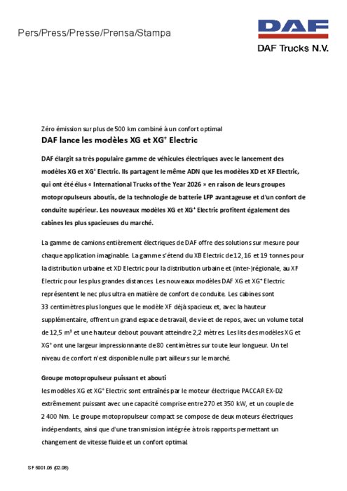 DAF élargit sa très populaire gamme de véhicules électriques avec le lancement des modèles XG et XG+ Electric. Ils partagent le même ADN que les modèles XD et XF Electric, qui ont été élus « International Trucks of the Year 2026 » en raison de leurs groupes motopropulseurs aboutis, de la technologie de batterie LFP avantageuse et d'un confort de conduite supérieur. Les nouveaux modèles XG et XG+ Electric profitent également des cabines les plus spacieuses du marché.